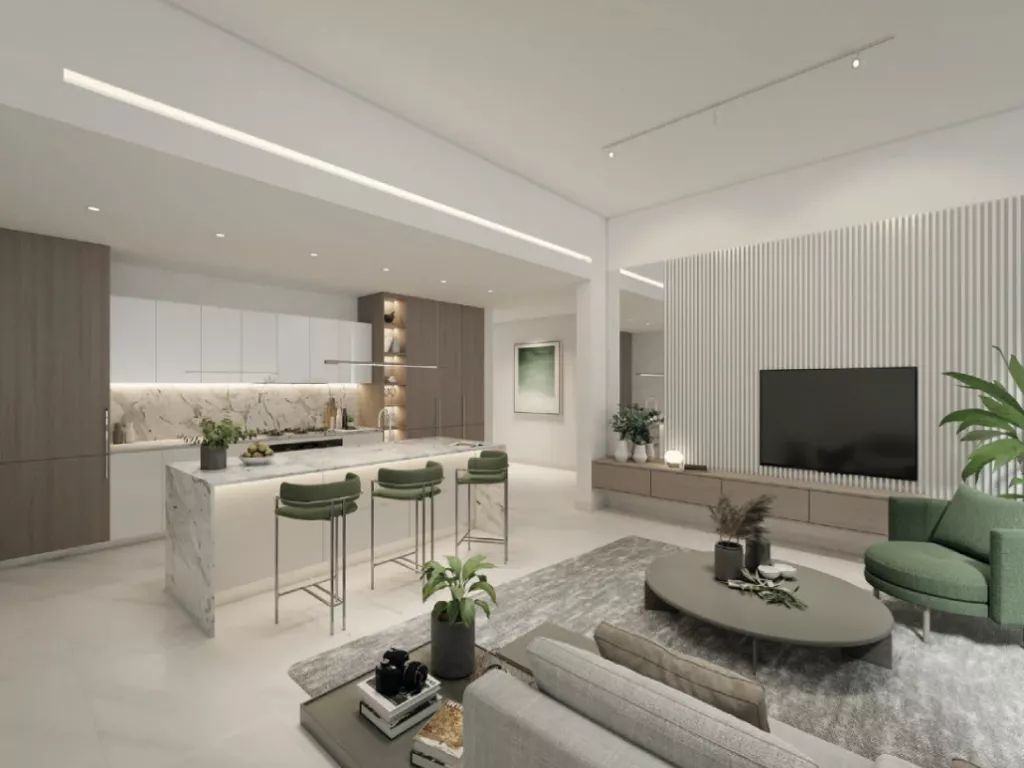 В комплексе представлены студии, апартаменты с 1–4 спальнями и роскошные дуплексы с 4 спальнями. Интерьеры выполнены в минималистичном стиле с нейтральной цветовой палитрой и элементами комфорта, подходящими для семейной жизни. Открытые кухни с мраморными столешницами, просторные гостиные, уединённые спальни с выходом на балкон, а также современные ванные комнаты с деталями из орехового дерева и латуни создают атмосферу элегантности и функциональности.