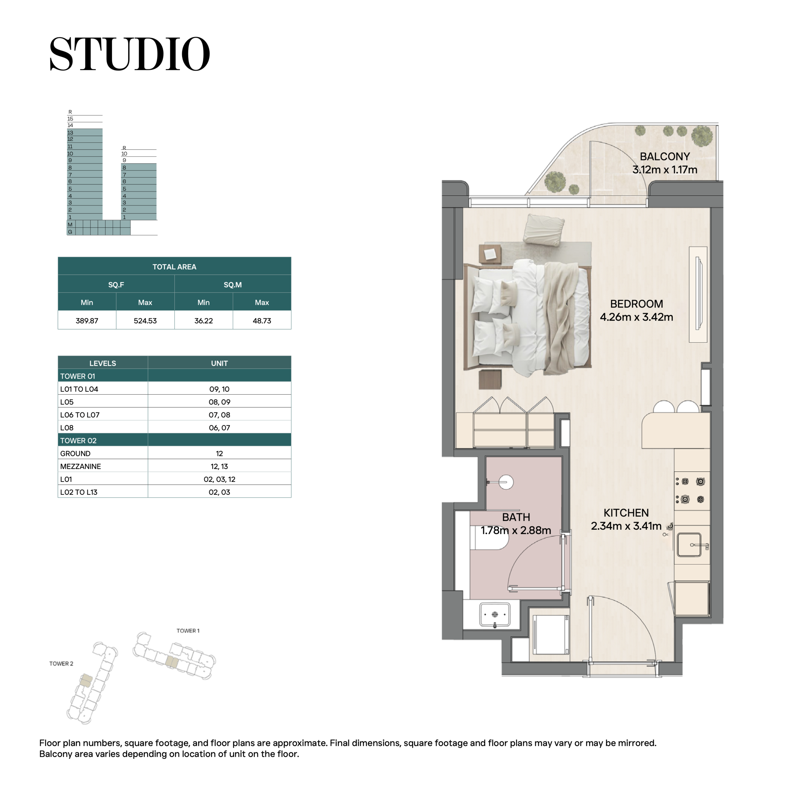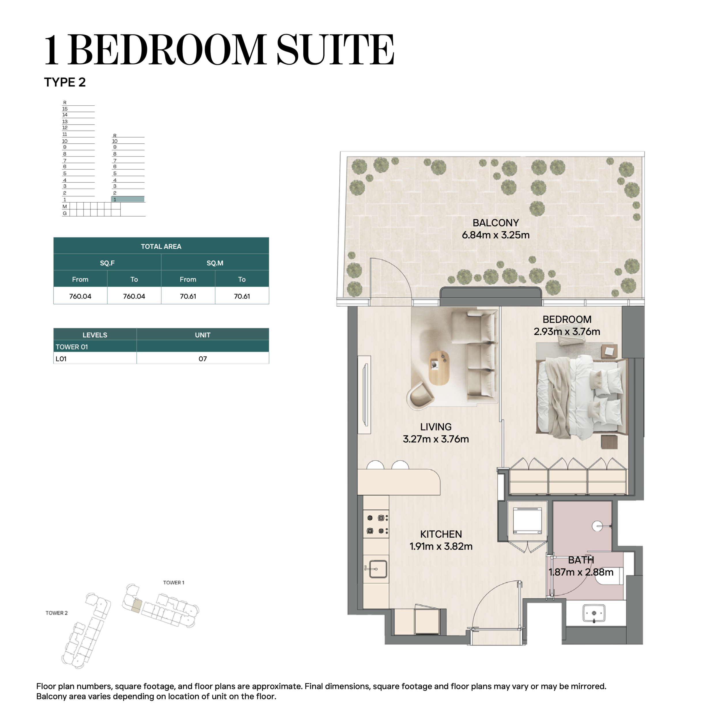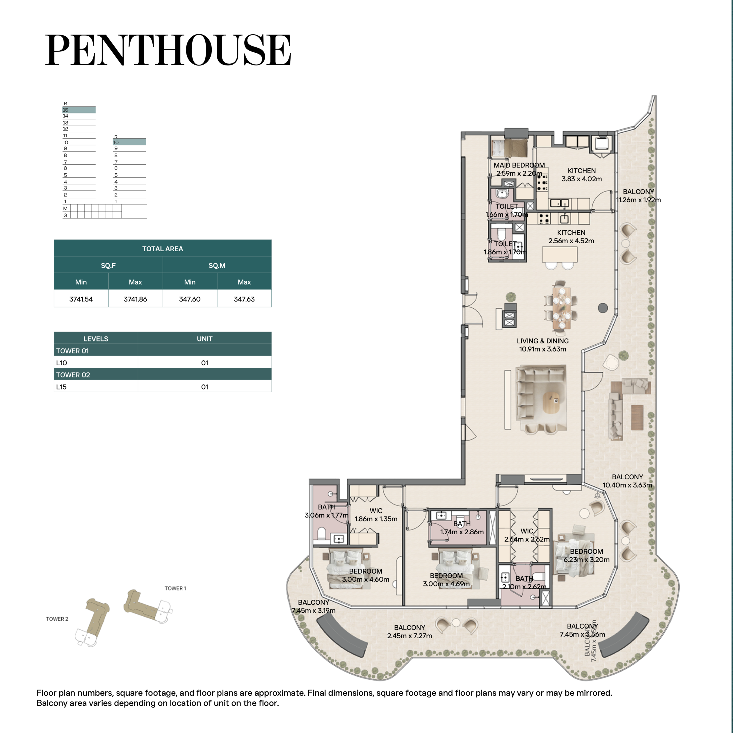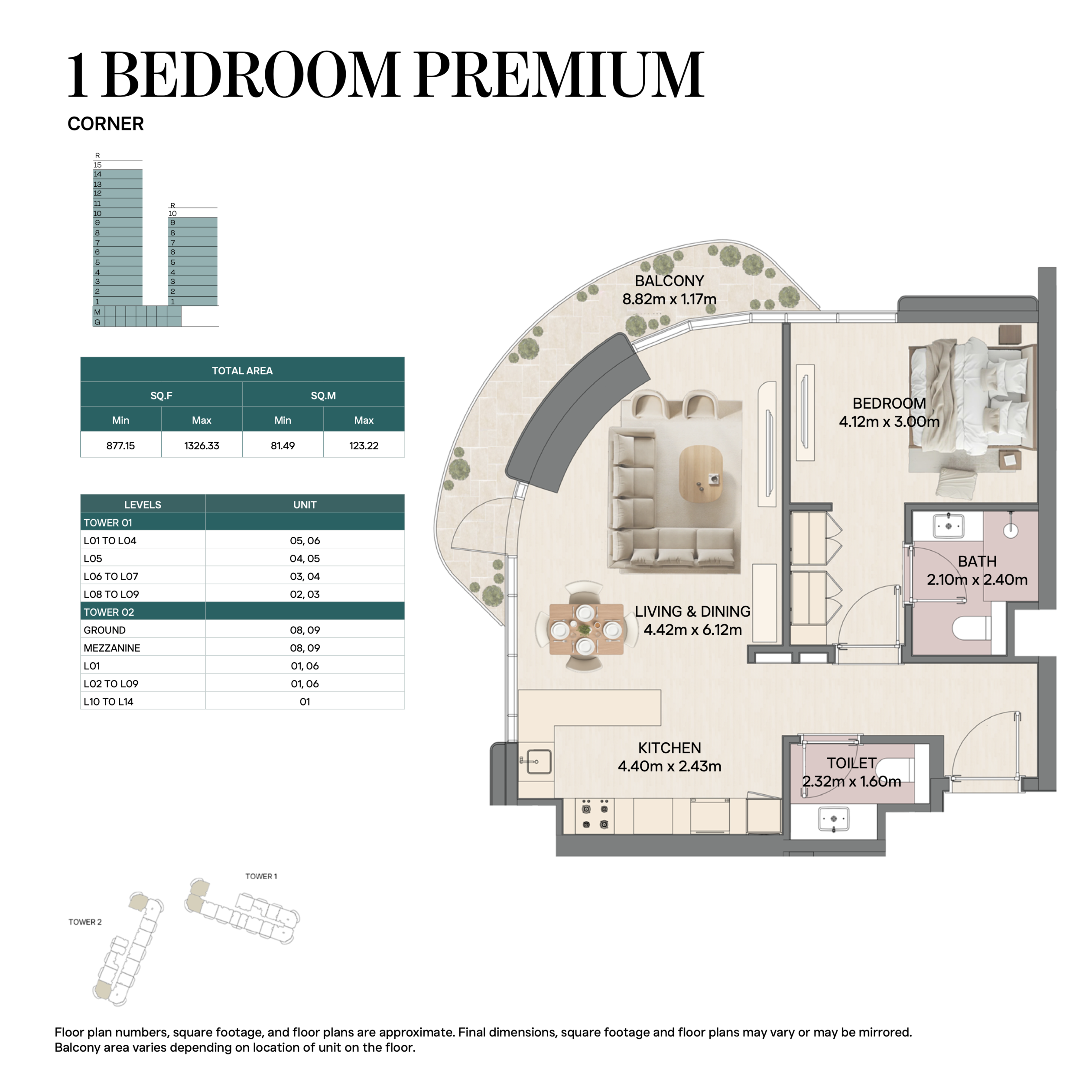 Все виды жилья выполнены с открытой планировкой: просторная гостиная-столовая связана с кухней, большие окна пропускают естественный свет, а верхние уровни (для дуплексов и пентхаусов) имеют приватные террасы и двойную высоту потолков.