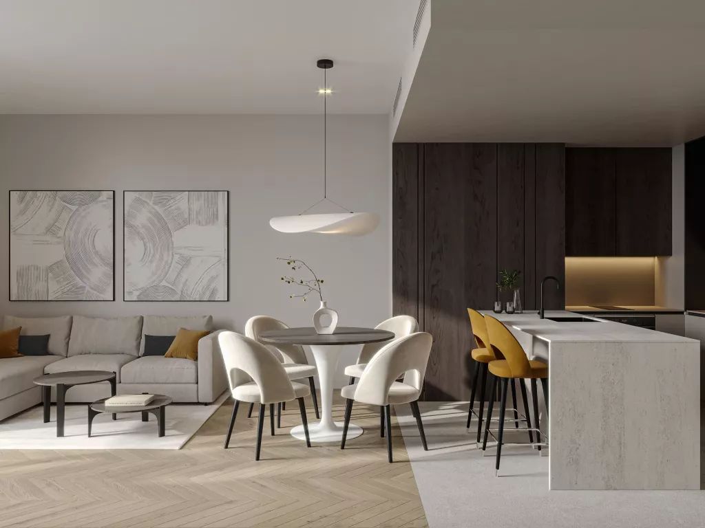 Проект включает полностью мебелированные студии, а также просторные апартаменты с одной и двумя спальнями, обеспечивая удобные и функциональные планировки для различных стилей жизни.