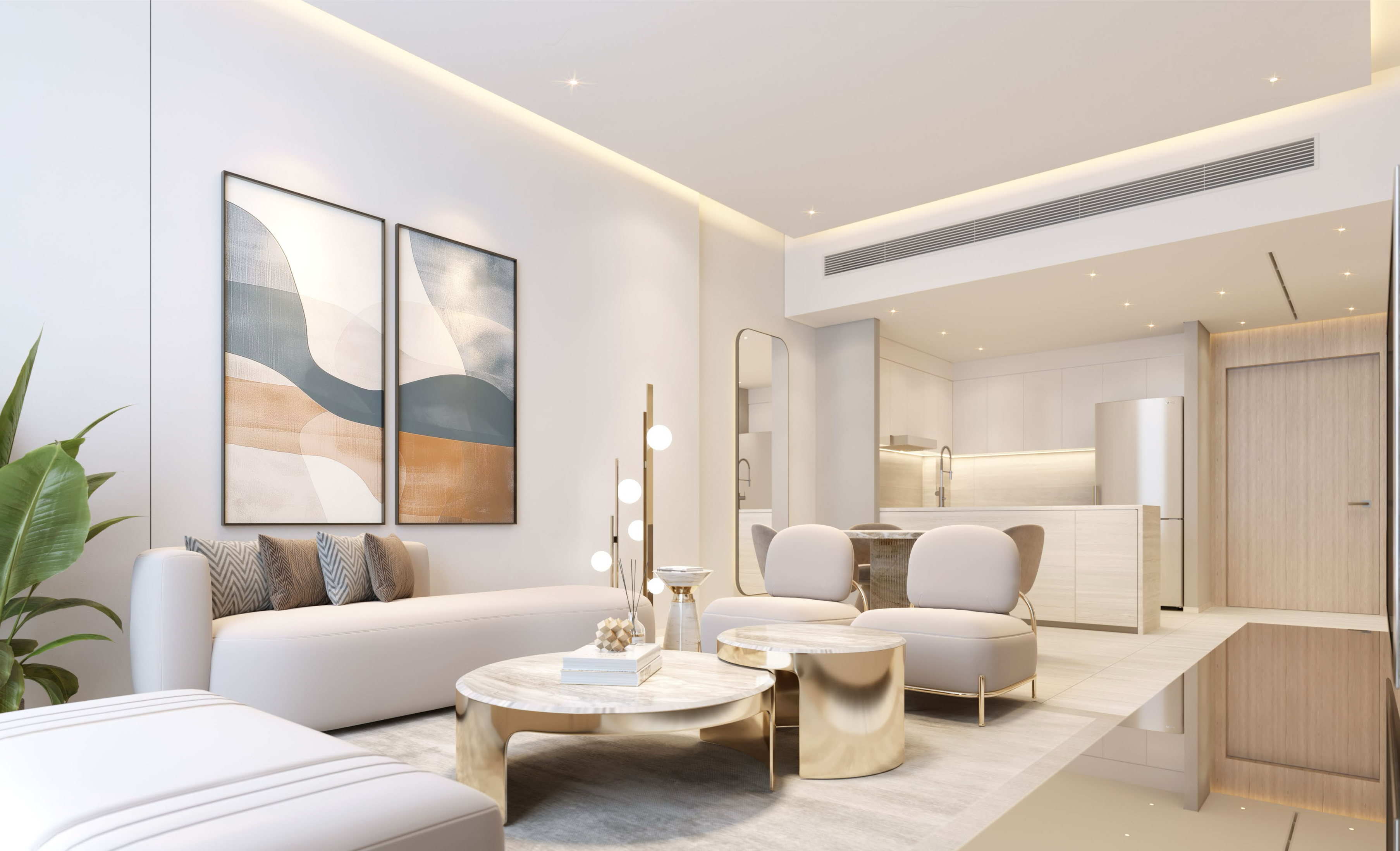 Интерьеры комплекса SkyGate Tower в районе Jumeirah Village Triangle спроектированы так, чтобы сочетать современную элегантность и уютную атмосферу. В дизайне использованы нейтральные и светлые оттенки, натуральные материалы — бежевый мрамор, тёплое дерево, стальные акценты — что придаёт пространству ощущение лёгкости и гармонии.
